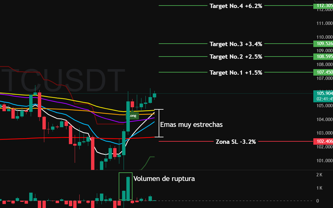 Nuestro indicador ha confirmado esta reversión, y podemos observar cómo las EMAs se encuentran muy estrechas y posicionadas por debajo del precio, actuando como un soporte dinámico y reforzando la tesis alcista. Esta compresión de las medias móviles a menudo precede a movimientos explosivos.