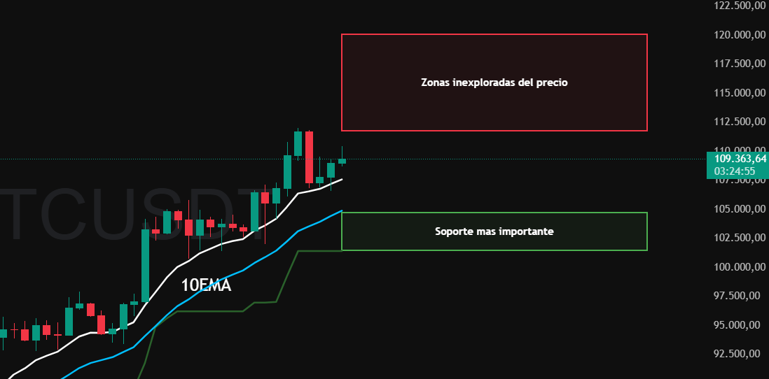 El impulso alcista se mantiene firme, evidenciado por el hecho de que el precio no ha cerrado por debajo de la media móvil exponencial (EMA) de 10 periodos. En este escenario de precios en zonas inexploradas, es un momento clave para considerar la toma de ganancias o mantener las posiciones largas.